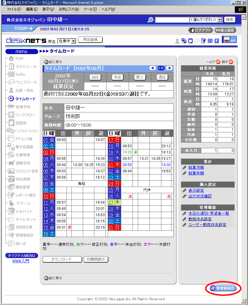 【タイムカード設定】欄の[管理者設定]リンクを押します。