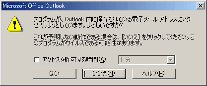 「同期」を実行すると、以下のメッセージが表示され、同期が停止する場合があります。この場合、”アクセスを許可する時間”にチェックをつけ、時間を選択し、「はい」ボタンをクリックしてください。「いいえ」ボタンをクリックすると、正常に同期できませんのでご注意ください。