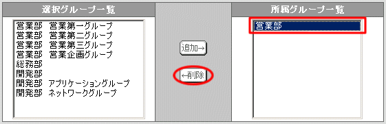 また「←削除」ボタンをクリックすると、ユーザがグループから外れます。 |