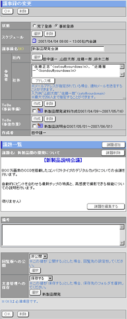 議事録の内容確認と、社内・社外メール通知先一覧から通知先の選択を行ってください。 ※社内・社外メール通知先一覧は、[管理者設定]-[メールサーバー設定]の、「各機能のメール送信機能の使用」項目で【使用する】を選択している場合に表示されます。