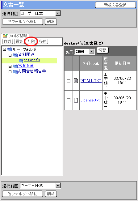 ボタンは、選択されているフォルダに削除権限が与えてられている場合のみ表示されます。