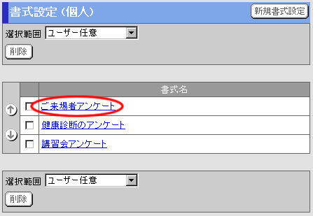 回答書式一覧画面の[選択範囲]欄より、削除したい書式を選択します。