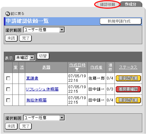 [選択範囲]欄のを押すと、該当する申請が未読に設定されます。を押すと、該当する申請を完了することができます。