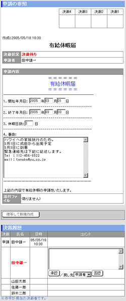 「否認」を行って差し戻しを行った場合、日時・コメントはクリアされずそのまま残ります。