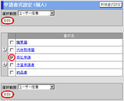申請書式一覧画面の[選択範囲]欄より、削除したい書式を選択します。