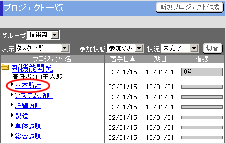 プロジェクト一覧の”タスク名”リンクを押します。