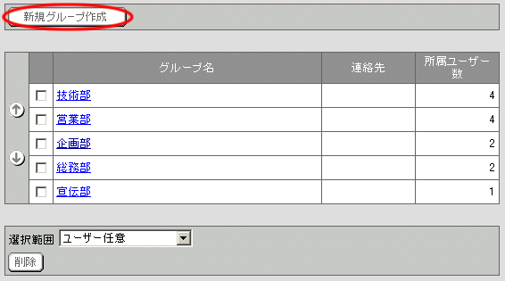 グループ一覧画面の[選択範囲]欄より、削除したいグループを選択してください。