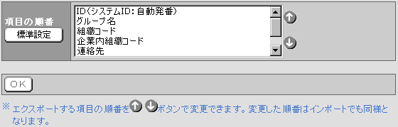 [項目の順番]欄で、エクスポートする項目の順番を設定します。 項目を選択し、 ボタンで順番を変更できます。 ※[標準設定]ボタンを押すと、項目の順番がデフォルトの順番に戻ります。