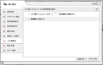 指定した経過日のメールを古い物から自動削除したい場合は、「ゴミ箱に入ったメールを○○日経過後に削除する」を選択してください。
