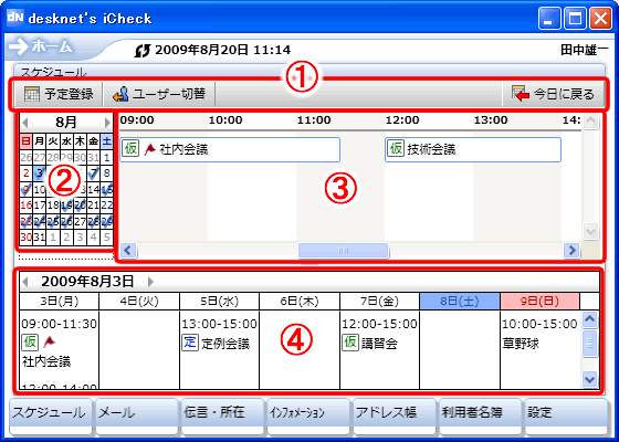 「スケジュール」メニューをクリックすると、スケジュールのカレンダー、個人一日、個人週間ビューが表示されます。