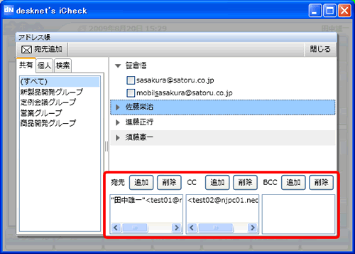 アドレス一覧から追加したいメールアドレスを選択して、追加する宛先、CC、BCCの「追加」ボタンをクリックします。