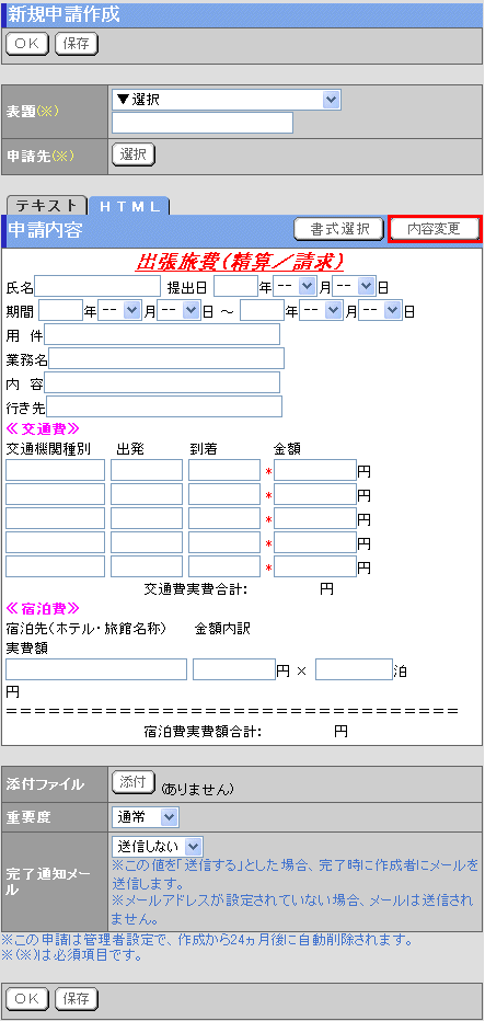 ワークフロー,回覧・レポート,アンケートの「内容/書式」をHTMLで作成できます。
