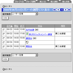 リスト表示の”週間”リンクを押すと、週間のスケジュールが一覧表示されます。