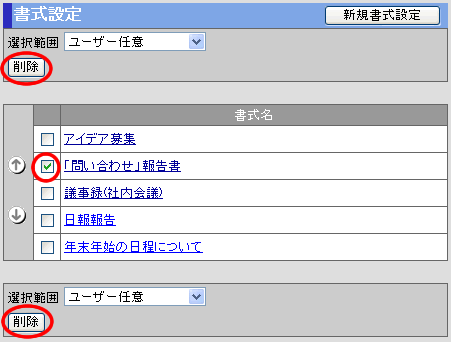 書式一覧画面の[選択範囲]欄より、削除したい書式を選択します。