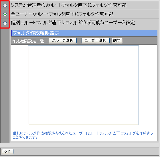 【文書管理設定】欄の[フォルダ作成権限設定]リンクを押します。
