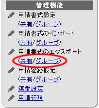 サブウィンドウの【管理機能】欄にある[申請書式のエクスポート(共有/グループ)]リンクを押します。 申請書式(共有)のエクスポートを行う場合は[共有]リンクを、書式(グループ)のエクスポートを行う場合は[グループ]リンクを押してください。