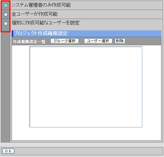 プロジェクトの作成権限を変更します。 作成権限の対象グループ、ユーザーを選択して[作成権限設定一覧]に設定します。 プロジェクト作成権限を設定するグループを選択する場合は、を押してください。 グループ選択に関してはこちら プロジェクト作成権限を設定するユーザーを選択する場合は、を押してください。 ユーザー選択に関してはこちら