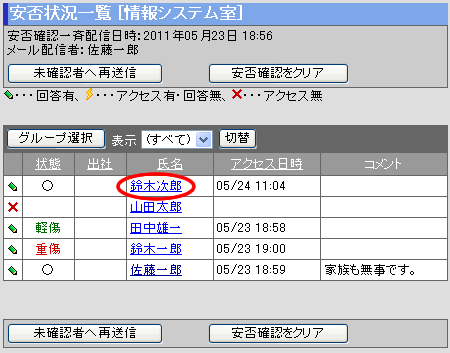 と、 アイコンが付いているユーザーに対して、安否状況確認メールを再送信します。