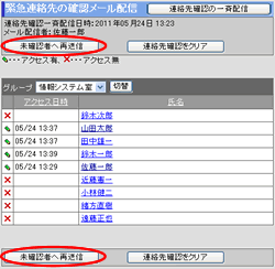緊急連絡先の確認一覧画面にある「未確認者へ再送信」ボタンを押します。
