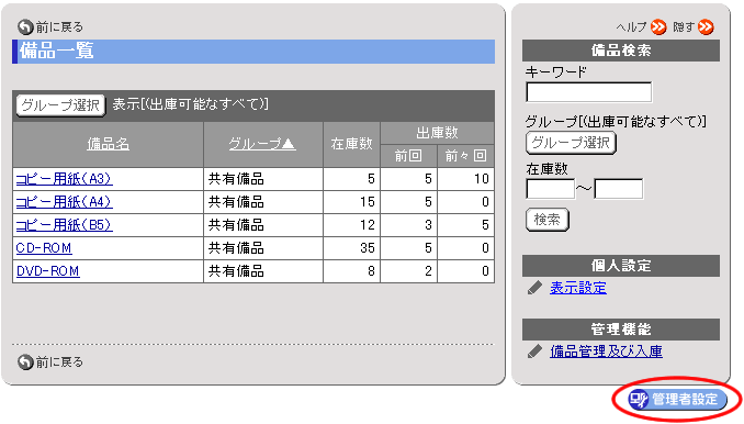 【備品管理設定】欄の[管理者設定]リンクを押します。