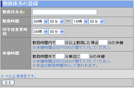 勤務体系の登録画面で勤務体系情報を入力してください。