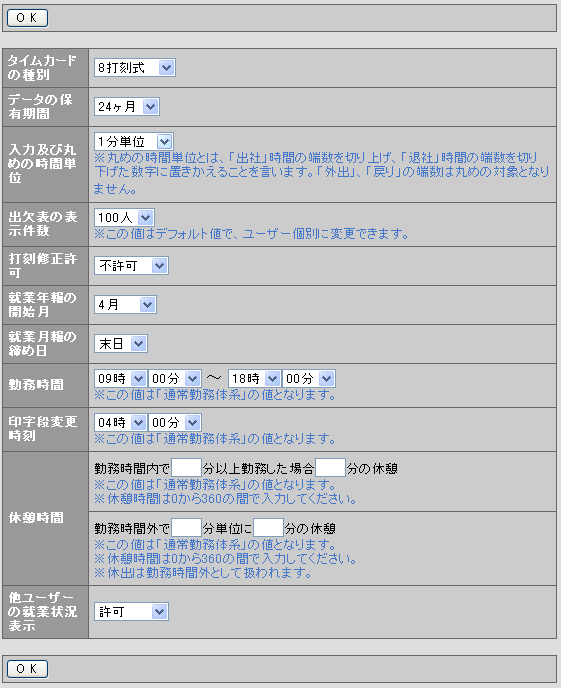 タイムカードのデータを保存する期間を設定します。保存期間は”無期限”、”1ヶ月〜24ヶ月”を選択できます。 |