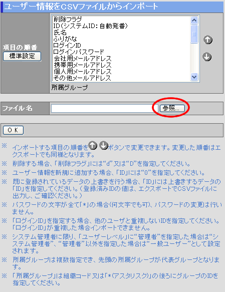[参照]ボタンを押して、インポートするファイルを選択します。 [ファイル名]欄に直接ファイル名を記入する場合には、フルパスで指定してください。