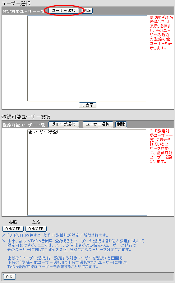 【ToDo設定】欄の[登録可能ユーザー設定]リンクを押します。
