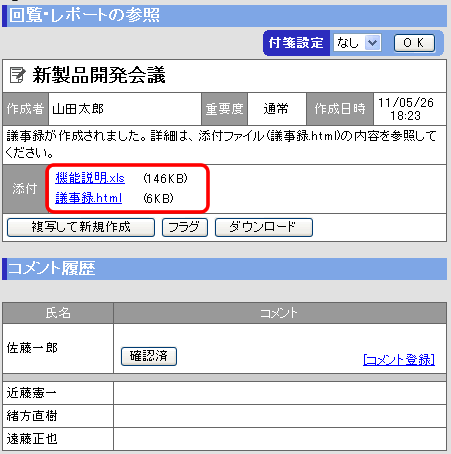アイコンがついている回覧・レポートの表題リンクをクリックすると、議事録の内容を添付した回覧・レポートを参照することができます。