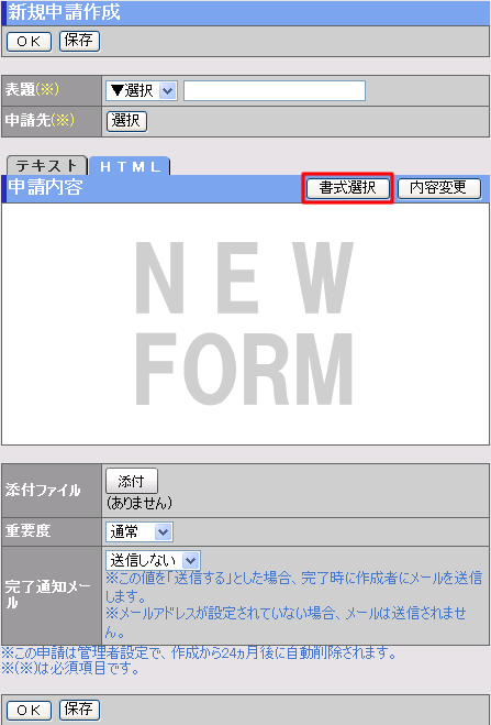 ワークフロー,回覧・レポート,アンケートの「内容/書式」をHTMLで作成できます。