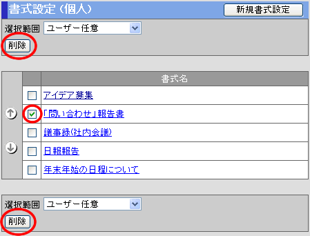 書式一覧画面の[選択範囲]欄より、削除したい書式を選択します。