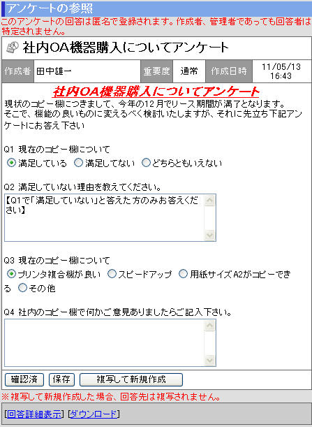 また、「回答詳細表示」の回答一覧は、回答者の氏名、確認日時が表示されず、回答番号が表示されます。