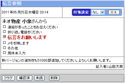 伝言の詳細が表示されます。 [付箋設定]欄で色を選択し、を押すと、この伝言の付箋を貼り付けることができます。 この伝言にフラグを設定したい場合、を押してください。もう一度を押すと、フラグは解除されます。 を押すと、この伝言は確認済みとなります。 既読の伝言の場合にを押すと、この伝言は未読となります。 を押すと、この伝言は削除されます。