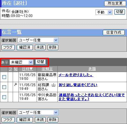 [表示]欄で選択されている条件に該当する伝言が一覧表示されます。