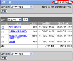 使用できるメモの容量が設定されている場合、メモ一覧に[使用率]が表示され、[使用率]が100%を超えると新規にメモを作成することはできません。