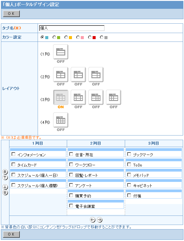 [タブを追加]リンクをクリックすると、ポータルデザイン設定画面が表示されます。タブ名、カラー設定、レイアウトを入力して「OK」ボタンを押すと、タブが追加されポータルを使用することができます。