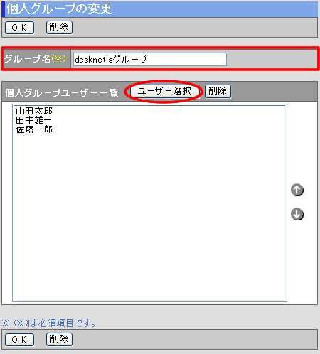 ※[削除]ボタンを押すと、個人グループを削除することができます。