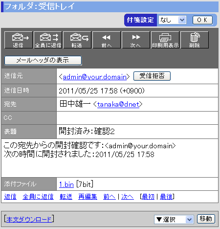 受信者が開封確認のメールを送信した場合、元の送信者へ開封済みメールが送信されます。