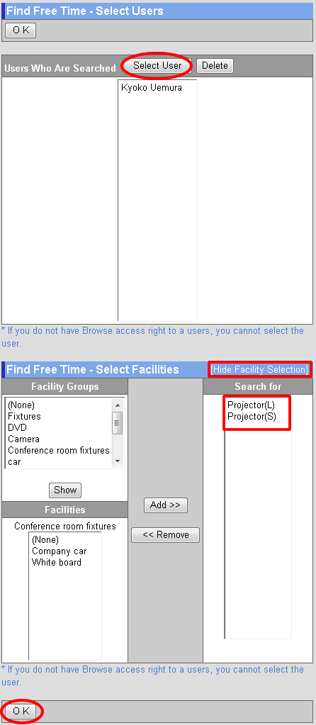 Selected users will be displayed in [Search for] and they can be searched to find their free time in a week.