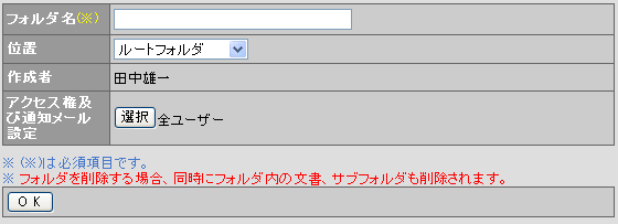 登録するフォルダに対してアクセス権限の設定と、文書を追加・変更・削除した際に通知メールを送信する設定を行うことができます。 |