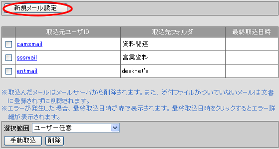 取り込んだメールは取込元メールサーバから削除されます。 |