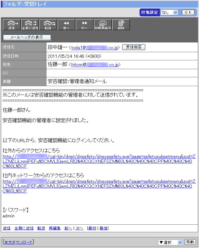 「管理者設定」によって配信された安否確認の管理者通知メールを参照します。