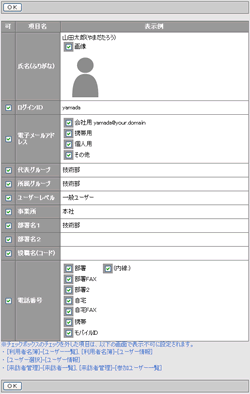 項目名の左にある選択欄から表示可、不可を設定します。 ・・・表示不可 ・・・表示可 ※チェックボックスのチェックを外した項目は、以下の画面で表示不可に設定されます。 ・ [利用者名簿]-[ユーザー一覧] ・ [利用者名簿]-[ユーザー情報] ・ [ユーザー選択]-[ユーザー情報] ・ [来訪者管理]-[来訪者一覧] ・ [来訪者管理]-[参加ユーザー一覧]