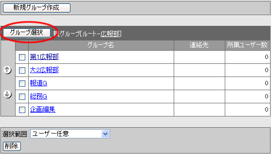グループ一覧画面の[選択範囲]欄より、削除したいグループを選択してください。