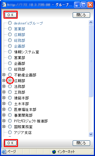 グループ一覧には、個人グループと、共有グループが表示されます。 グループに属しているグループを表示したい場合は、ツリーを展開していくことで属しているグループを表示できます。 ※個人グループは青色で表示され、共有グループは黒色で表示されています。