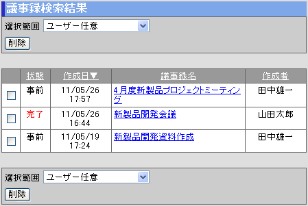 入力した検索条件に該当する議事録が一覧に表示されます。