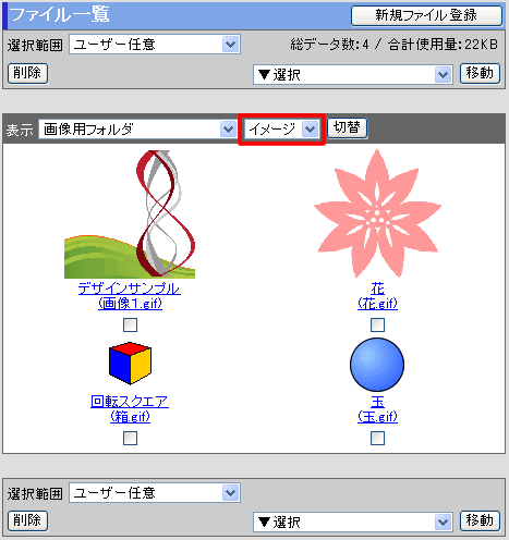 [表示]欄のフォルダ名を切り替えると、そのフォルダのファイル一覧に切り替わります。