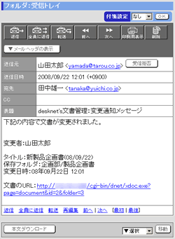「フォルダの登録・変更」画面で通知メールの設定を行ったフォルダに対して文書を登録した場合や、フォルダ内の文書を変更した場合、通知先に設定されているグループ、ユーザーに通知メールが届きます。