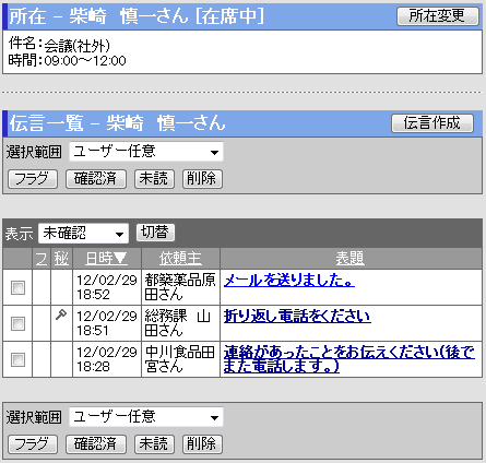 表示されたユーザー一覧の"ユーザー名"リンクを押すと、そのユーザーの伝言・所在が表示されます。