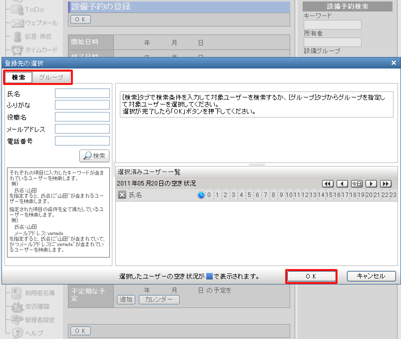 設備予約の登録画面で、[登録先]欄のを押します
